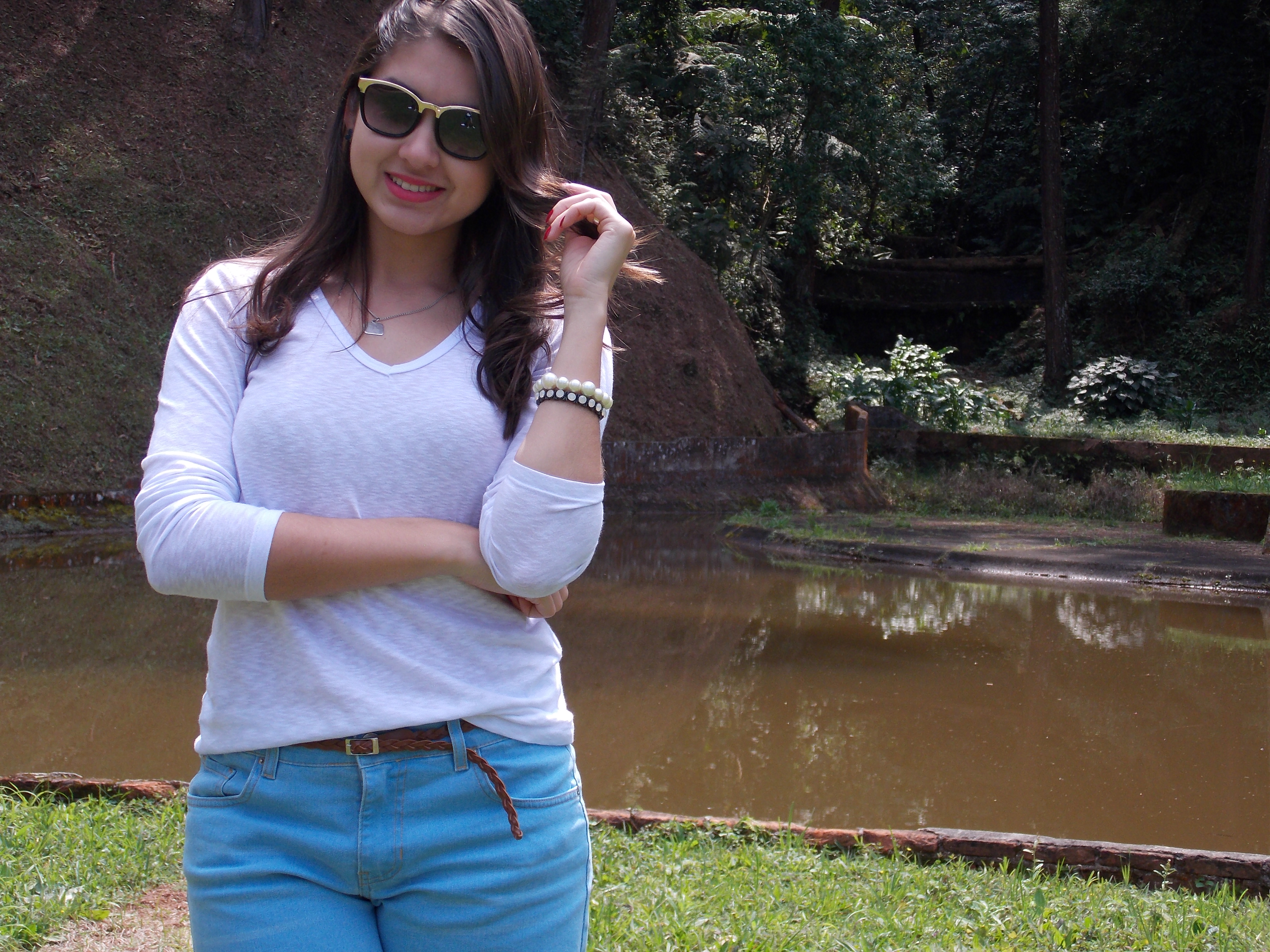 Oi geeeente! Tudo bem? Hoje vamos de look do dia para esses dias que está sol mas com um ventinho. Usei uma das combinações mais certeiras, jeans e blusinha branca. Eu amo! Porque dependendo da roupa você consegue ficar básica, clean e chic ao mesmo tempo. Como estava em um sítio usei shorts, blusinha e tênis. Não tem muito segredo, porém amei as fotos e quis compartilhar. Minha irmã que está me ajudando nas fotos ❤